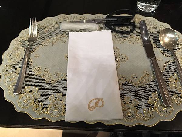 這是每個人的桌上所擺的餐具,最上面是手套還有剪刀, 吃龍蝦要用的!