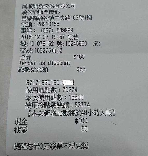 用16500點折抵55元, 只要付100元! 開心啦~
