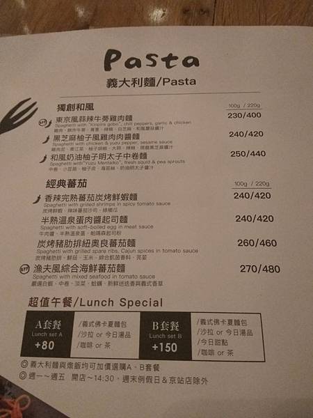 義大利麵菜單: