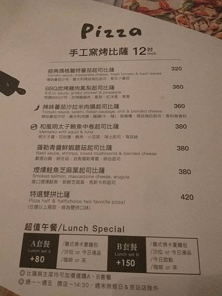 手工窯烤披薩菜單: