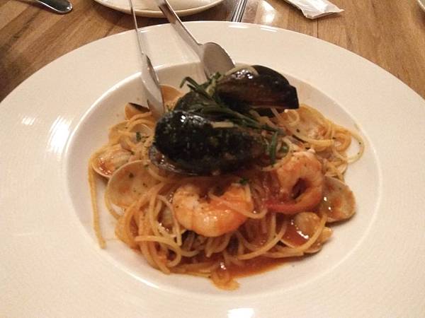 有3個淡菜+2尾蝦+一些蛤蜊跟花枝. 蕃茄醬汁味道偏清淡的, 整體不錯吃, 麵感覺也是偏硬了一點點的口感