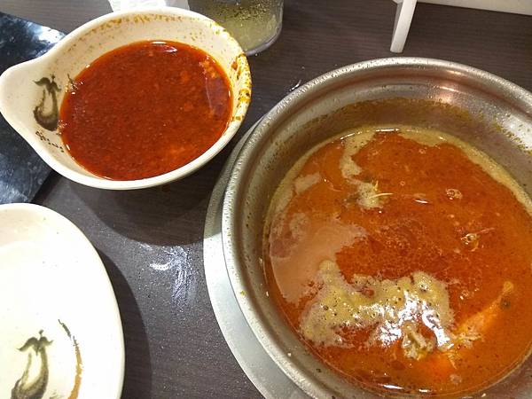 朋友點的麻辣鍋, 左邊的碗是後來加湯又給的麻辣原味湯頭