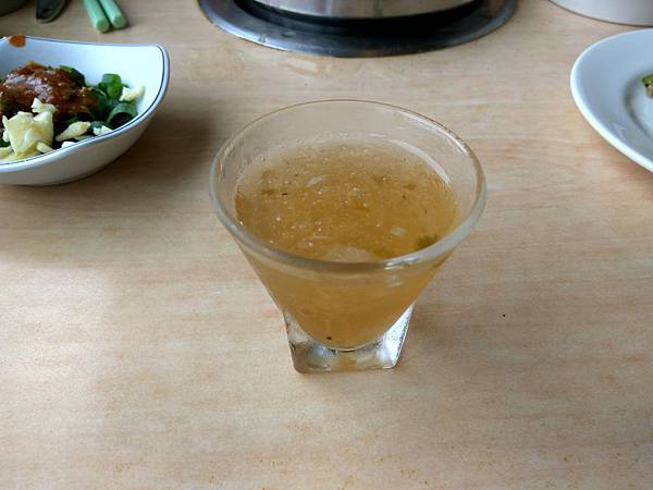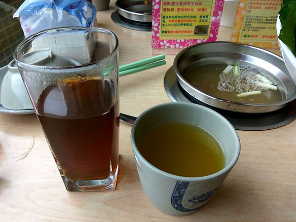 服務員先送來一杯熱茶, 喝起來像仙草干茶.(左). 右是柳橙汁