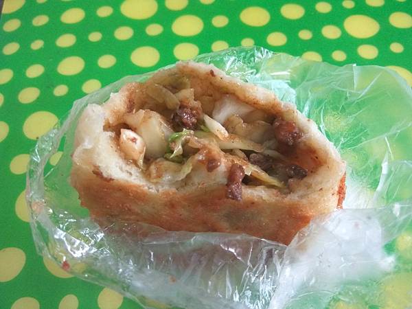這是葷的口味, 餅皮帶有微微酥香, 內餡部份, 高麗菜很鮮脆甜, 口感我個人挺喜歡, 混有些微的肉末跟肉皮, 會帶有一點點肥的部份(但極少)