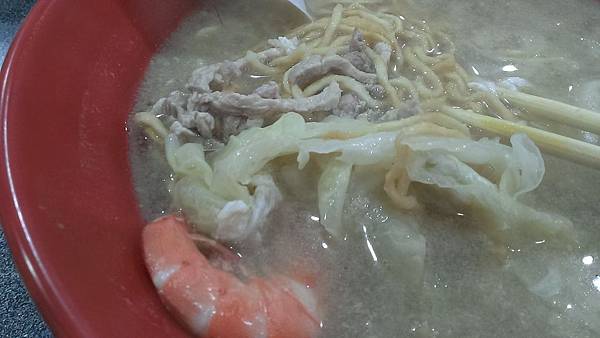 這是內用的鍋燒意麵, 配料的份量感覺算中等. 有一隻蝦子, 高麗菜, 蛤蜊, 豬肉絲, 跟火鍋料